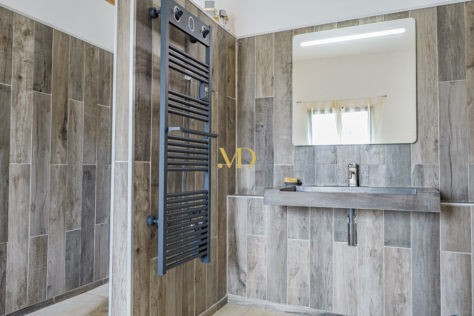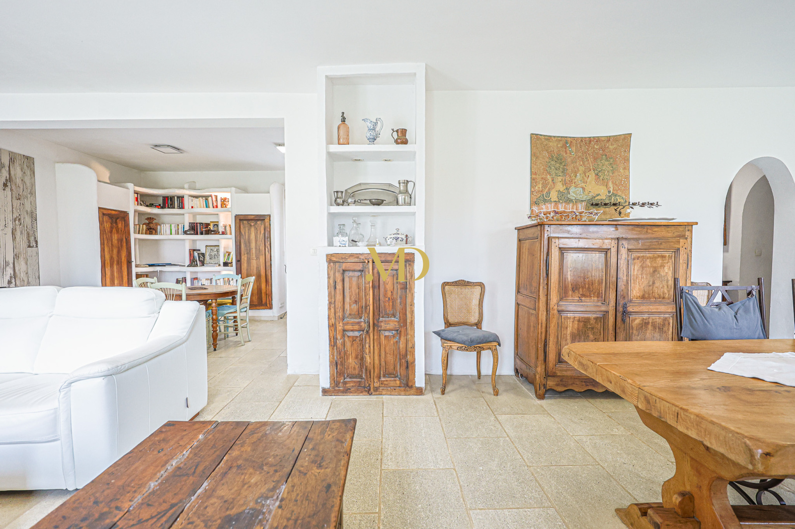 À l'entrée, un hall d’accueil distribue les différents espaces de vie avec un élégant escalier menant à l’étage. Sur la gauche, un bureau cosy permet d’envisager le télétravail ou un espace lecture au calme. L’espace de vie principal, généreux et lumineux, s’ouvre largement sur le jardin et une terrasse couverte en pierres et travertin, invitant à la détente et aux repas en extérieur. Le sol en pierre, provenant d’une carrière locale, confère à l’ensemble une ambiance chaleureuse et authentique.