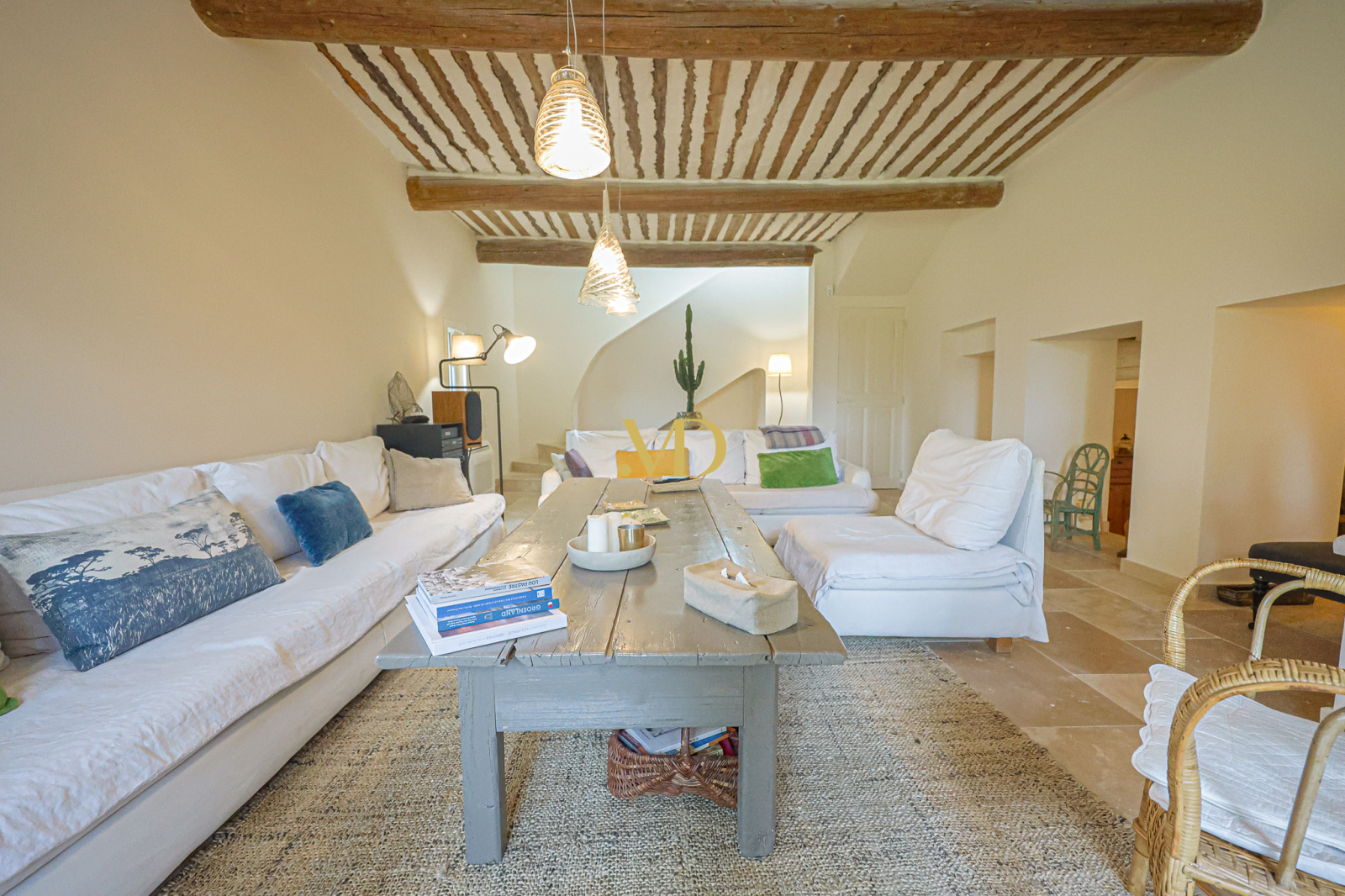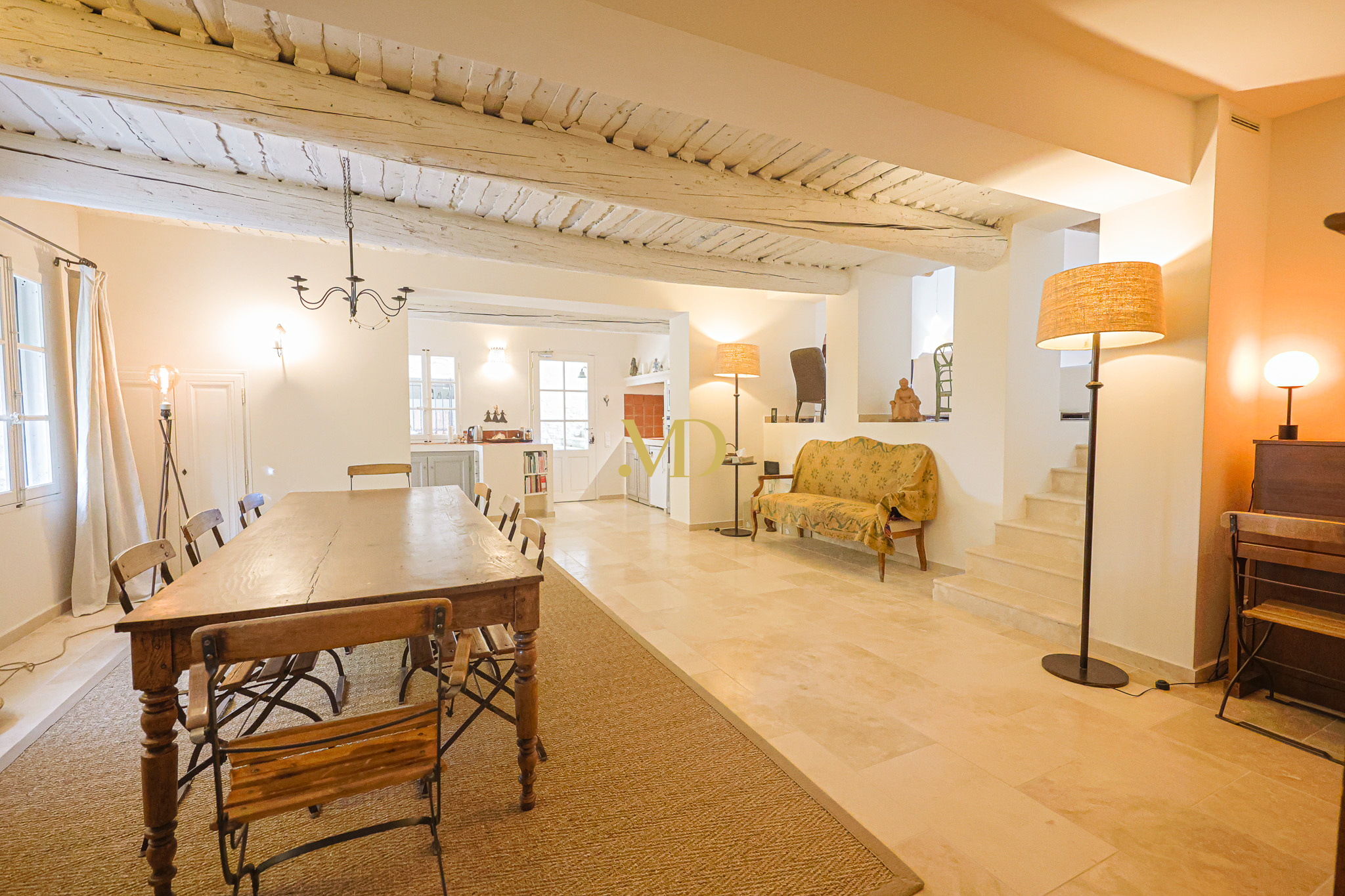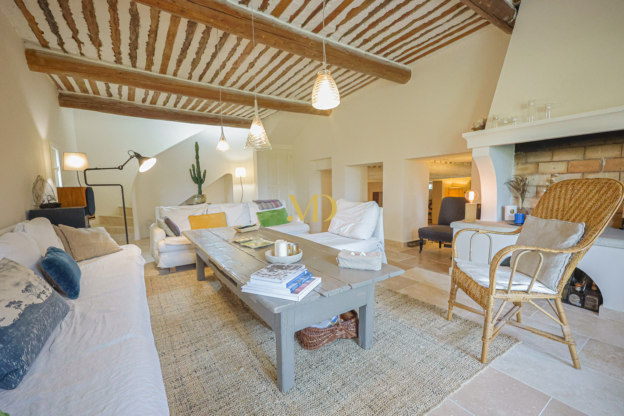 Au rez-de-chaussée, la bastide propose une vaste pièce de vie regroupant la cuisine et la salle à manger, ainsi qu’un salon lumineux avec cheminée, ouvrant sur une terrasse avec une vue panoramique.