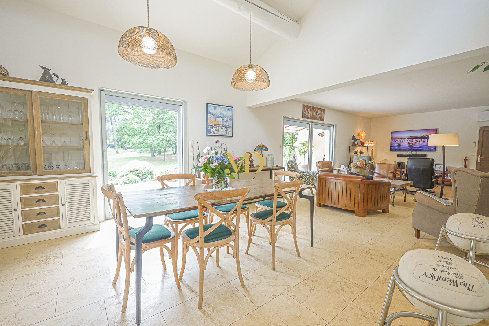 La maison, lumineuse et généreuse en volumes, s’ouvre largement sur l’extérieur grâce à de grandes baies vitrées à galandage offrant une vue imprenable sur le parc. La terrasse en pierre, agrémentée d’une pergola et d’un espace couvert, accompagne parfaitement la grande piscine, créant un véritable lieu de vie estival.