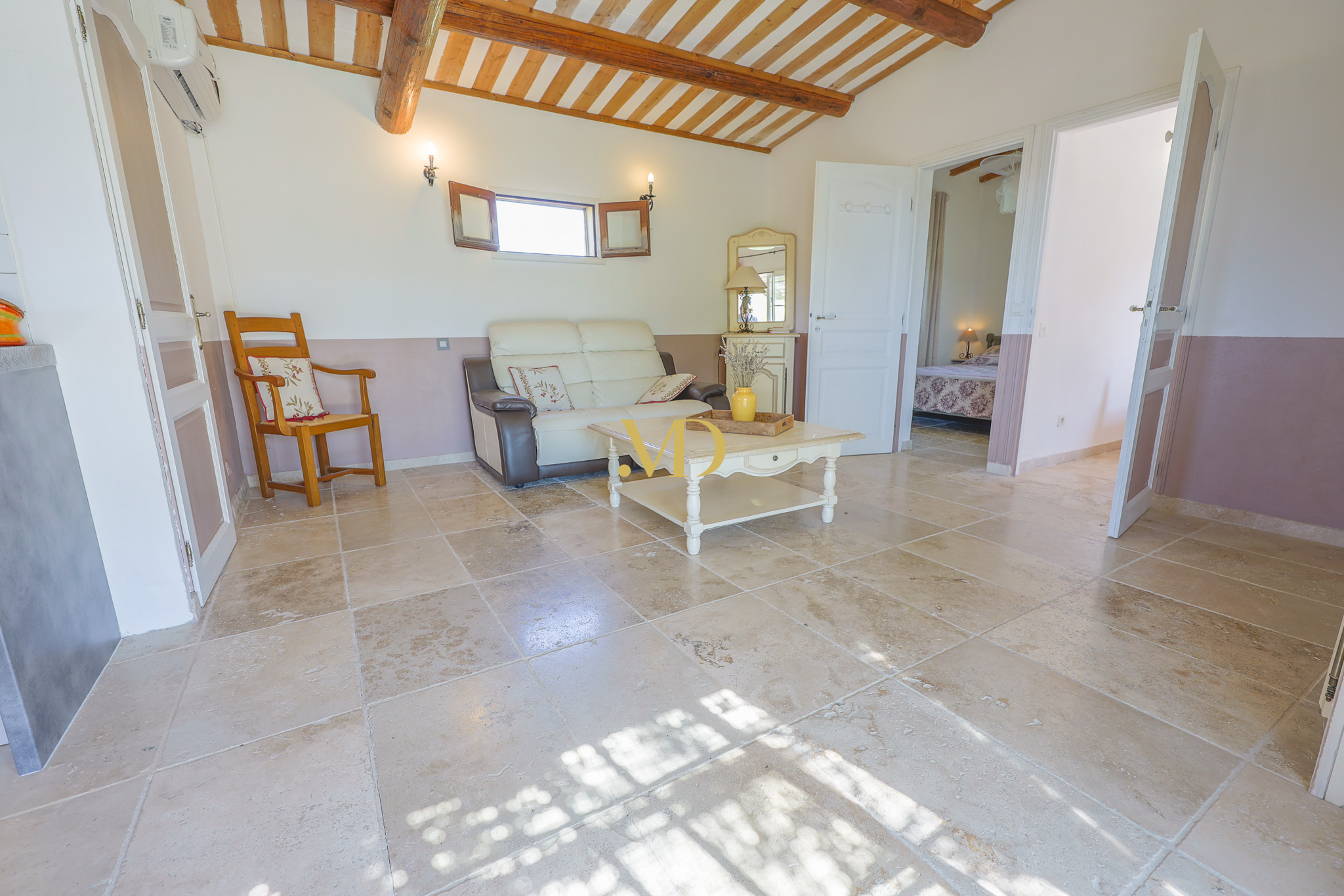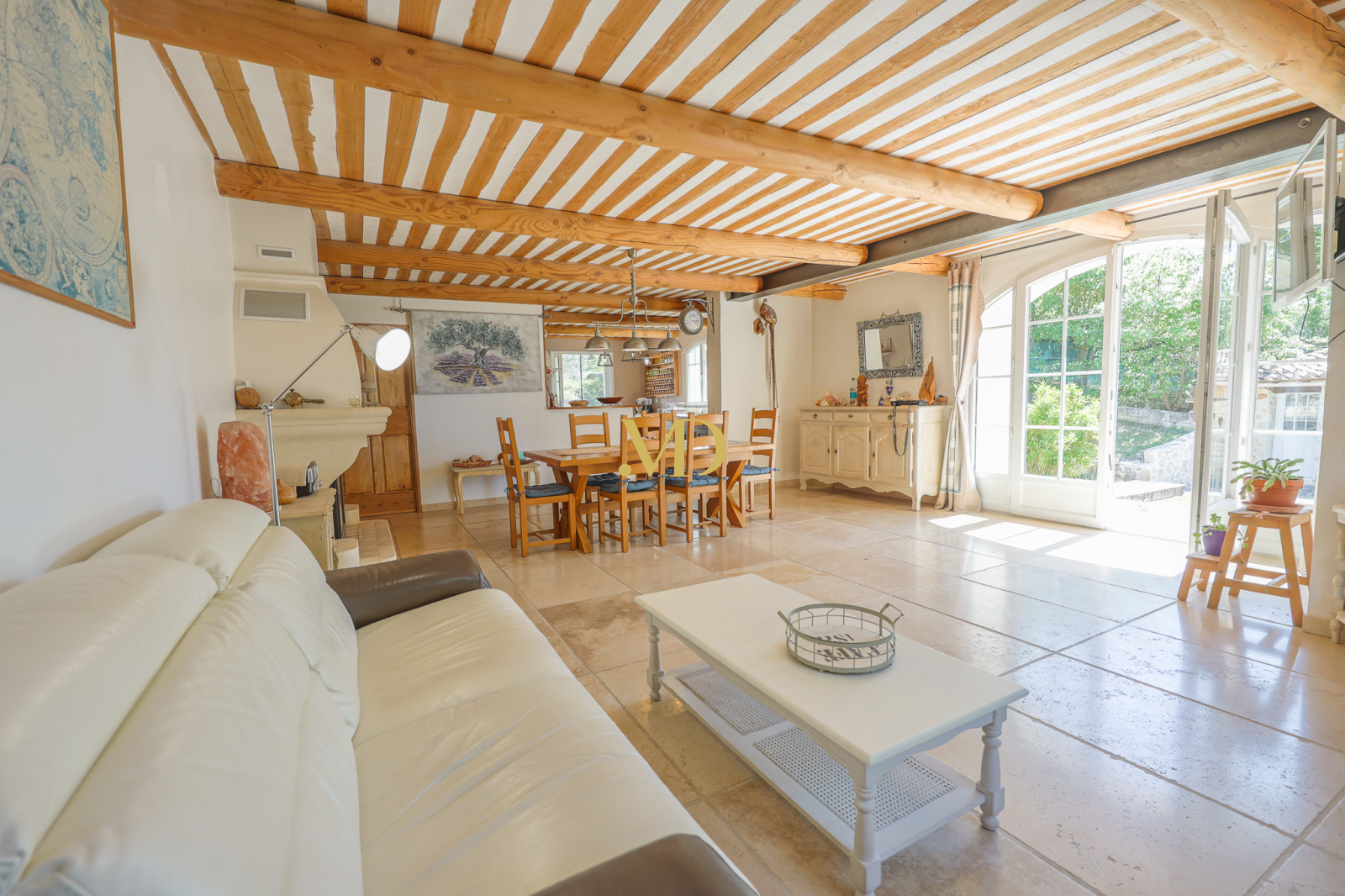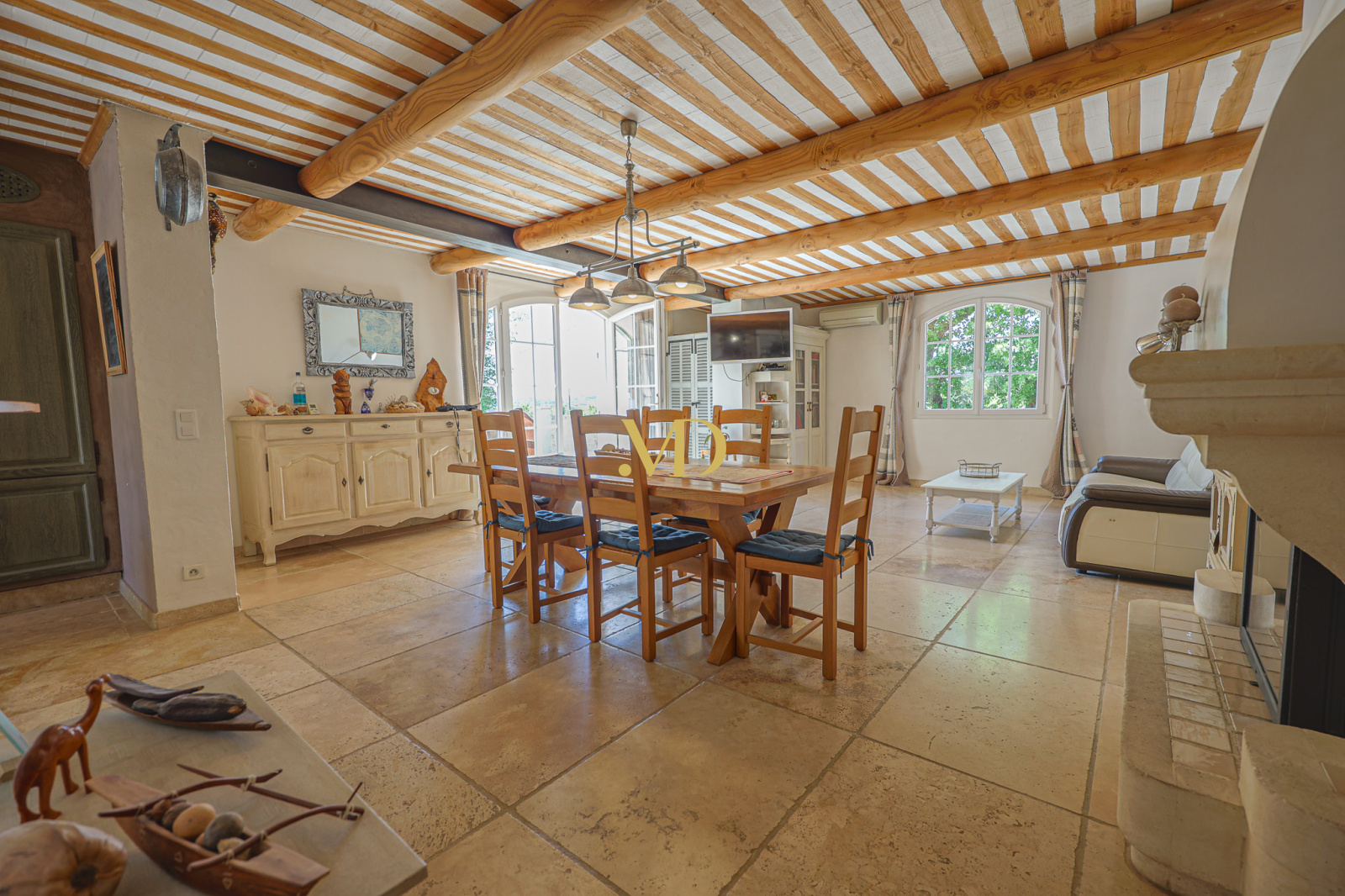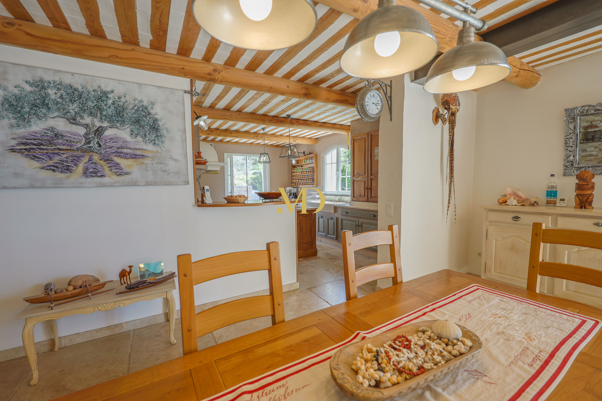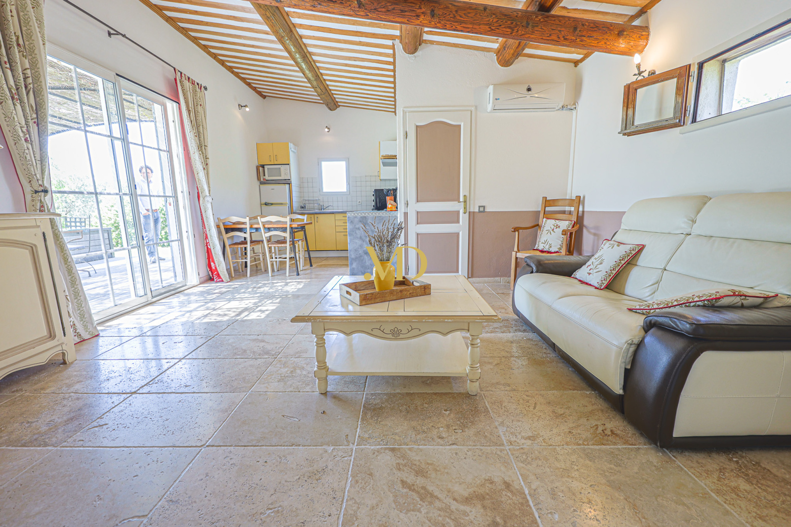 La maison principale, édifiée dans les années 1970 et entièrement repensée avec des travaux réalisés en 2013, offre environ 120 m² habitables. Elle propose de beaux volumes baignés de lumière, avec un vaste salon et salle à manger agrémentés d’un insert et d’une climatisation réversible. L’espace de vie s’ouvre naturellement sur une cuisine conviviale ainsi que sur les terrasses et la cuisine d’été, créant une parfaite continuité entre intérieur et extérieur.