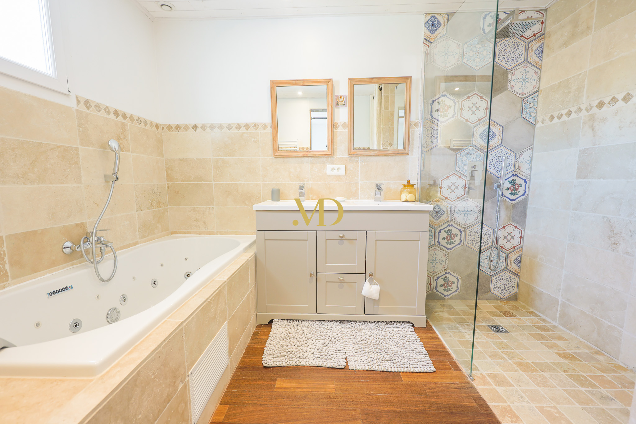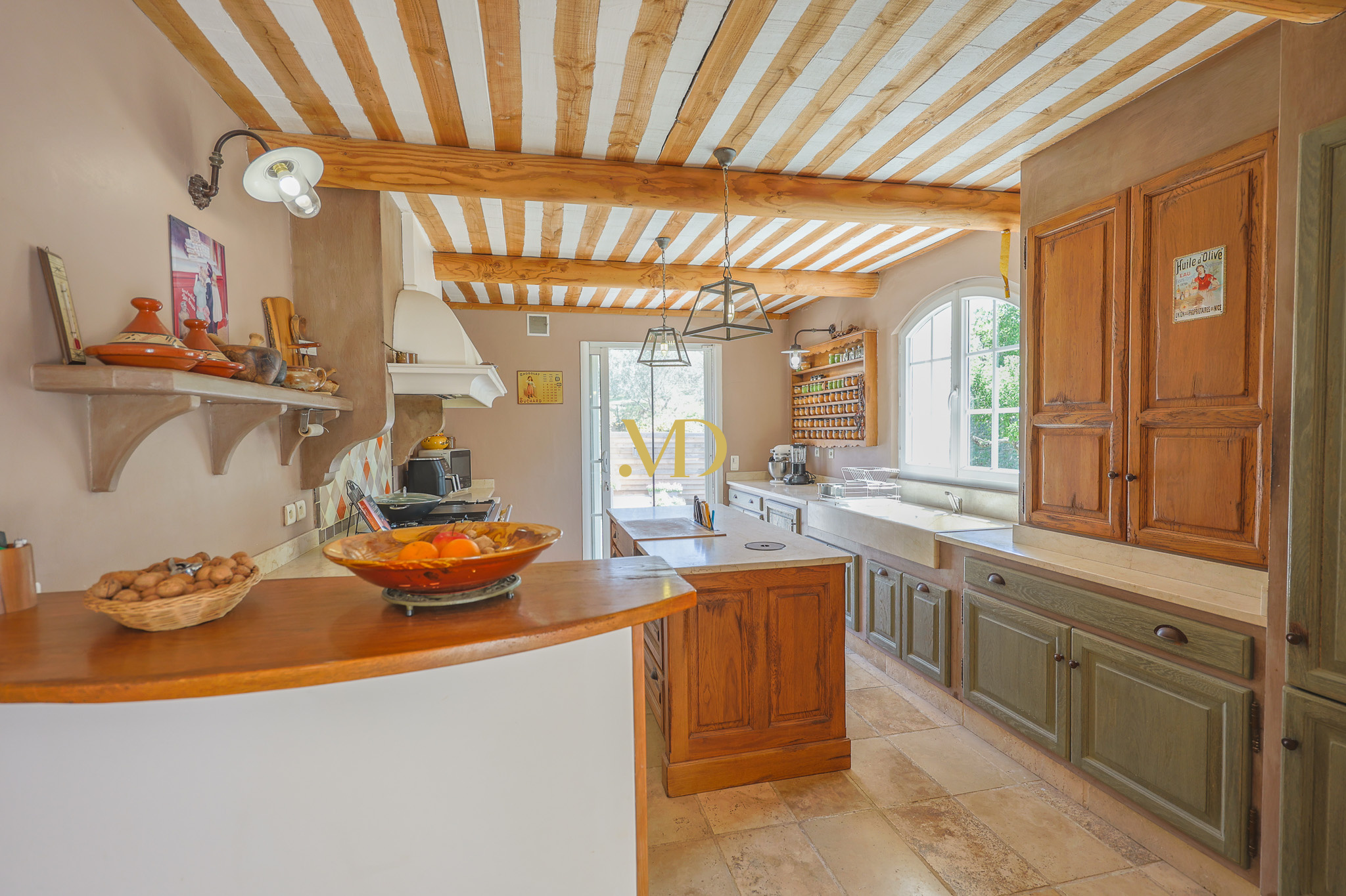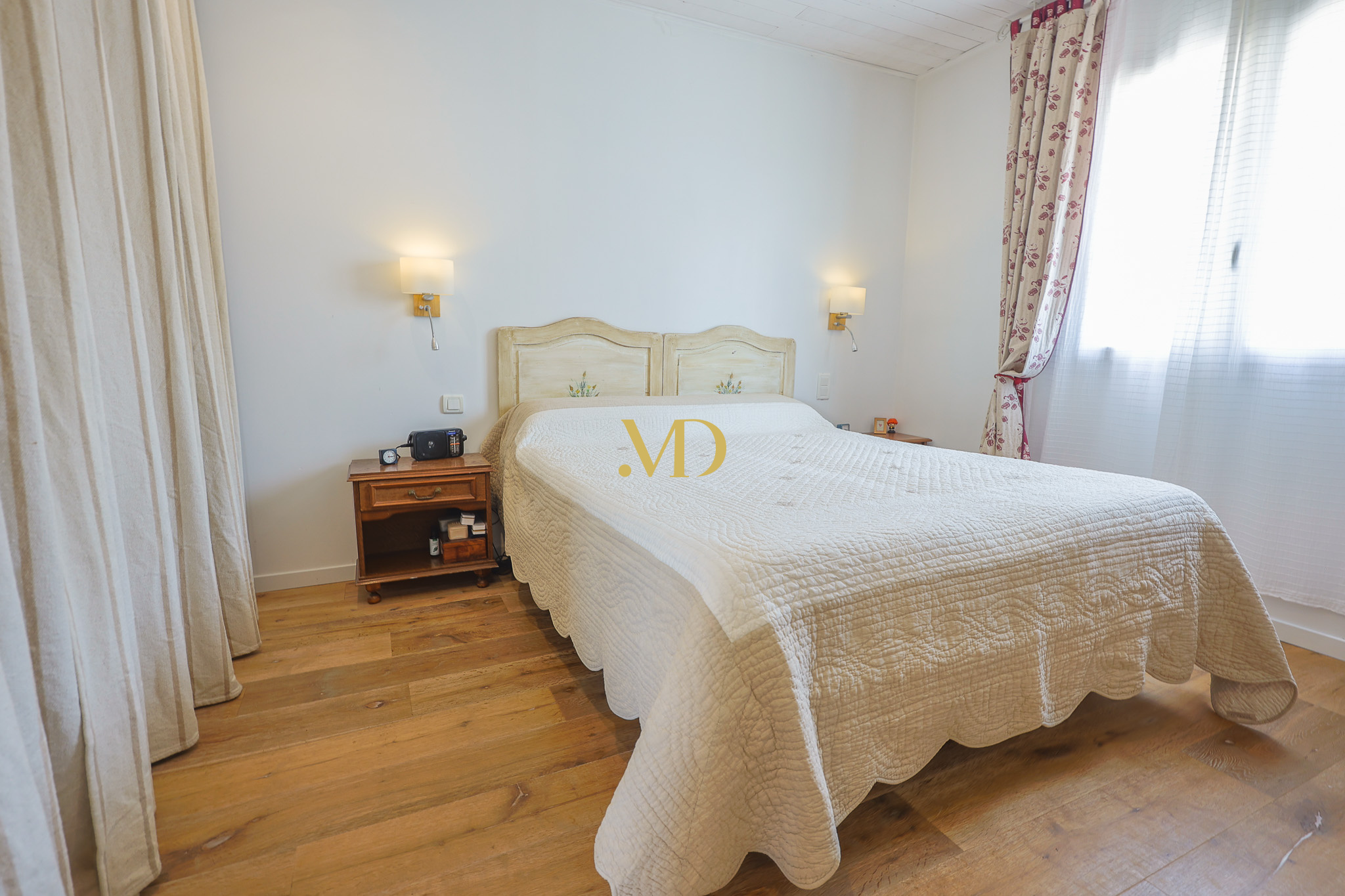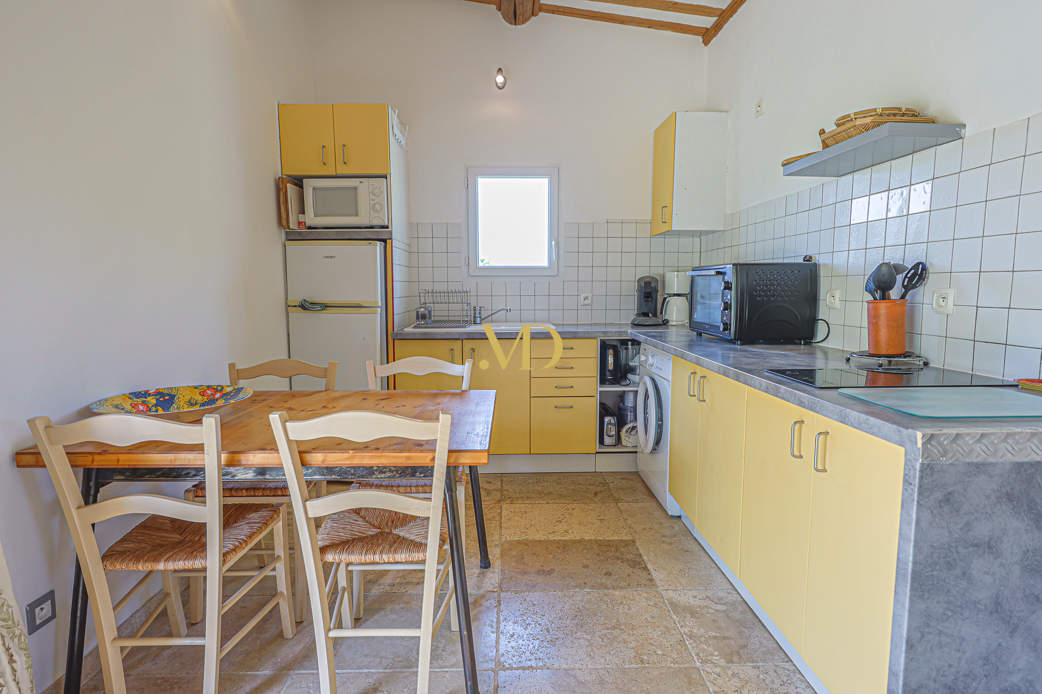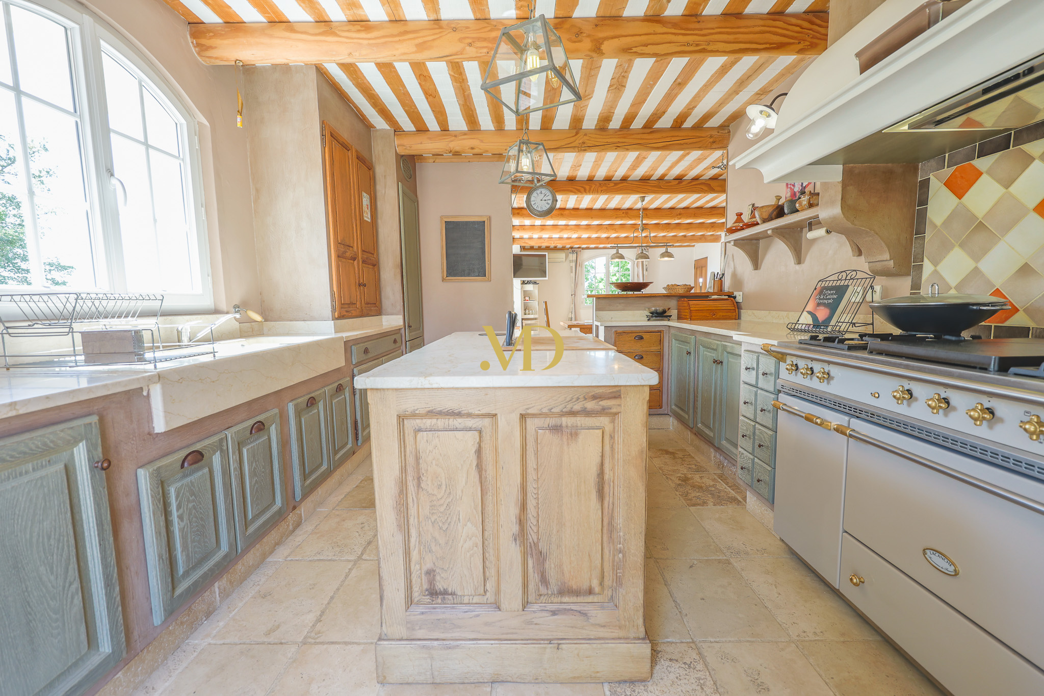 La maison principale, édifiée dans les années 1970 et entièrement repensée avec des travaux réalisés en 2013, offre environ 120 m² habitables. Elle propose de beaux volumes baignés de lumière, avec un vaste salon et salle à manger agrémentés d’un insert et d’une climatisation réversible. L’espace de vie s’ouvre naturellement sur une cuisine conviviale ainsi que sur les terrasses et la cuisine d’été, créant une parfaite continuité entre intérieur et extérieur.