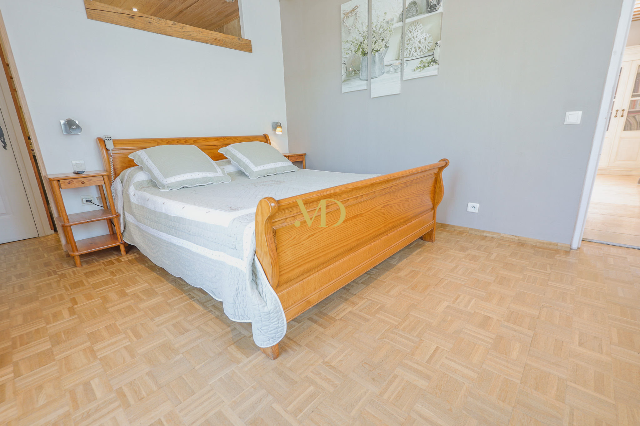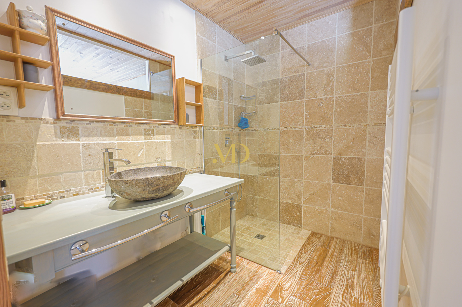 L’espace nuit comprend plusieurs chambres, dont une suite avec salle d’eau rénovée et accès direct à la terrasse, idéale pour envisager une activité de chambre d’hôtes. Un bureau, une salle de bains, des toilettes invités ainsi qu’une buanderie complètent l’ensemble. Les prestations intègrent également des panneaux solaires pour la production d’eau chaude et d’électricité.