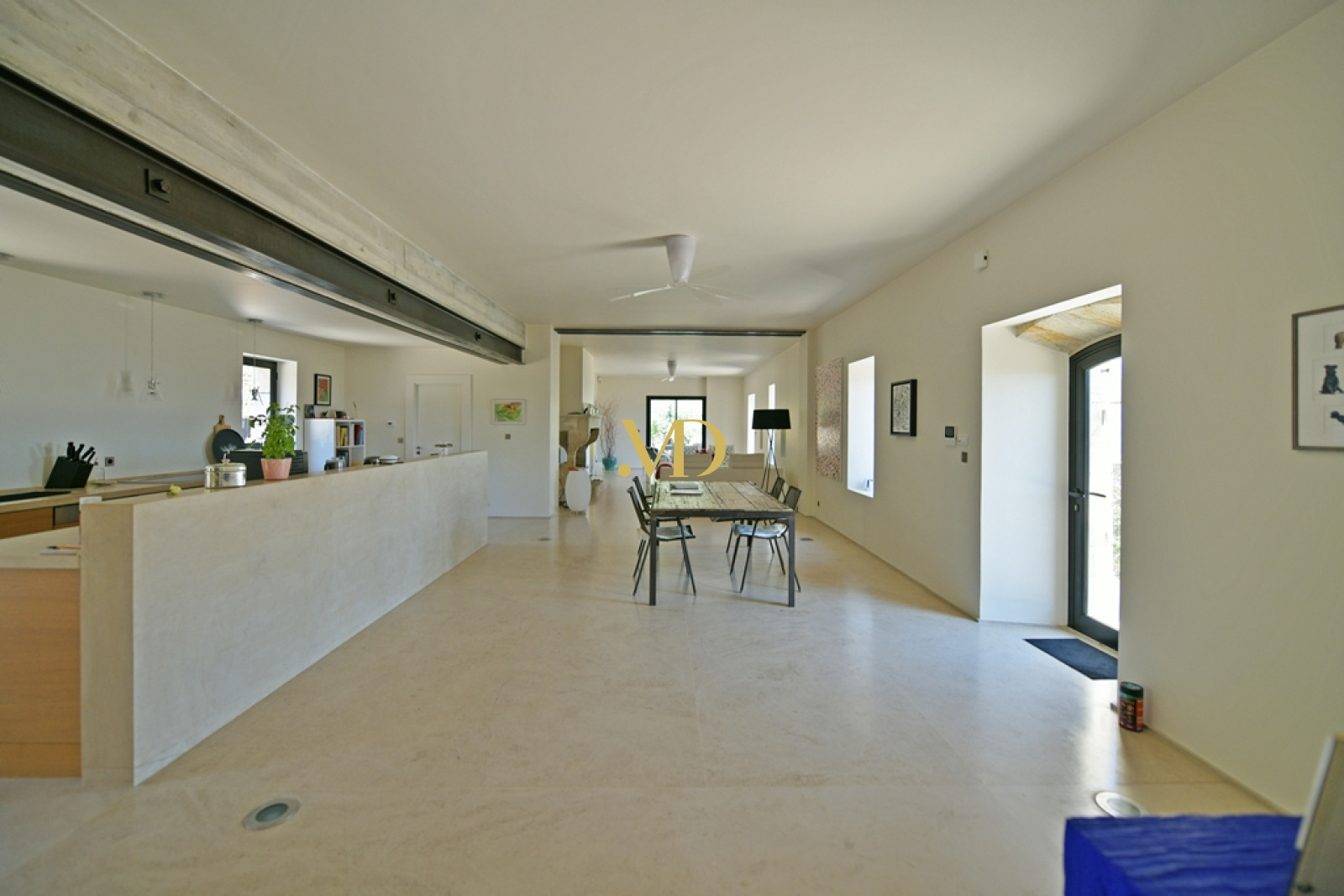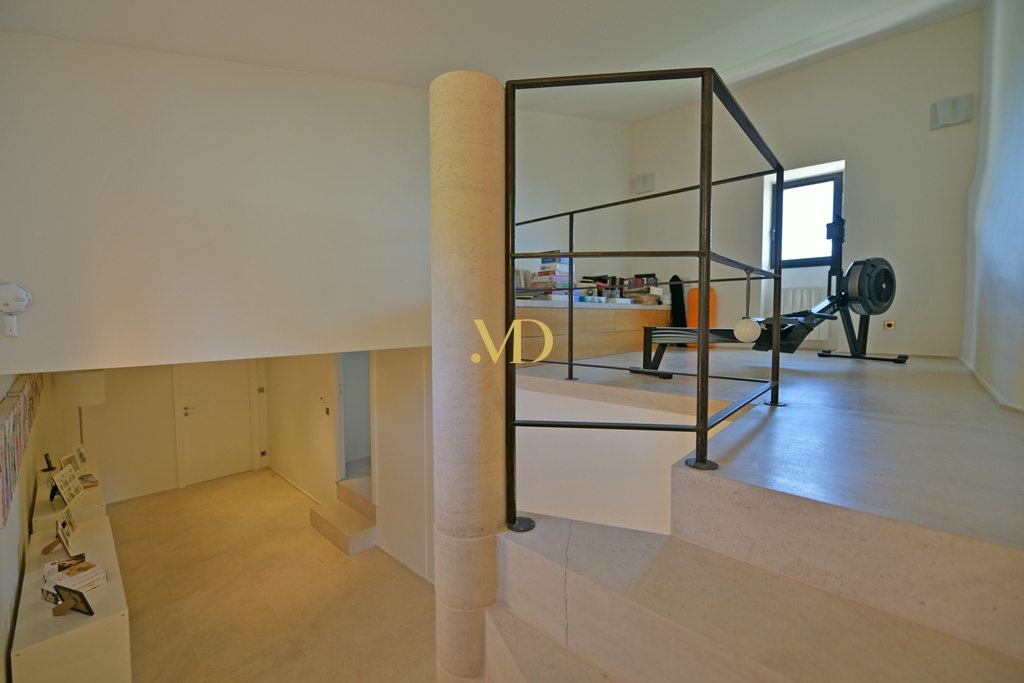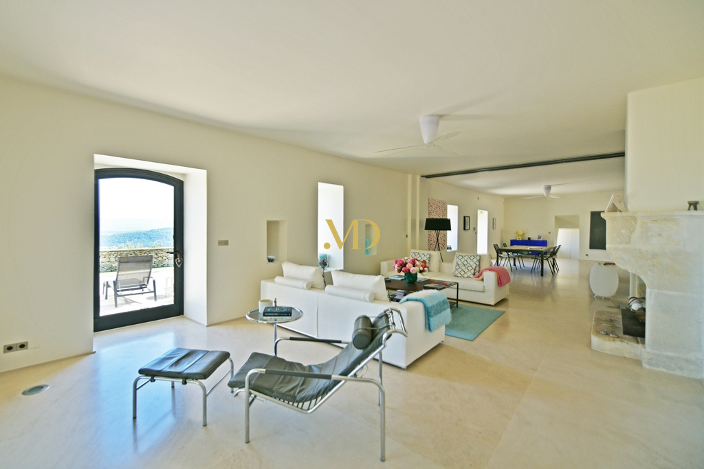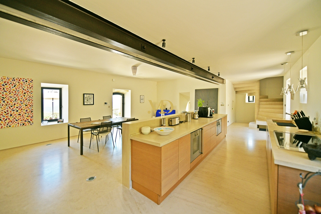 La bâtisse principale développe environ 300 m² habitables et s’articule autour de vastes terrasses engazonnées et dallées de pierre, invitant à profiter pleinement du panorama. Les volumes intérieurs sont généreux et baignés de lumière. Le niveau principal accueille un séjour traversant : côté salon, une cheminée en pierre du XVIIIe siècle apporte caractère et chaleur, prolongée par un second salon plus intime. De l’autre côté, la salle à manger s’organise autour d’un impressionnant îlot central, derrière lequel se dissimule une cuisine contemporaine entièrement équipée. Une arrière-cuisine avec buanderie donne accès à une terrasse couverte orientée au nord. Ce niveau est complété par un bureau spacieux avec pergola, ainsi qu’un vestiaire et des sanitaires invités.