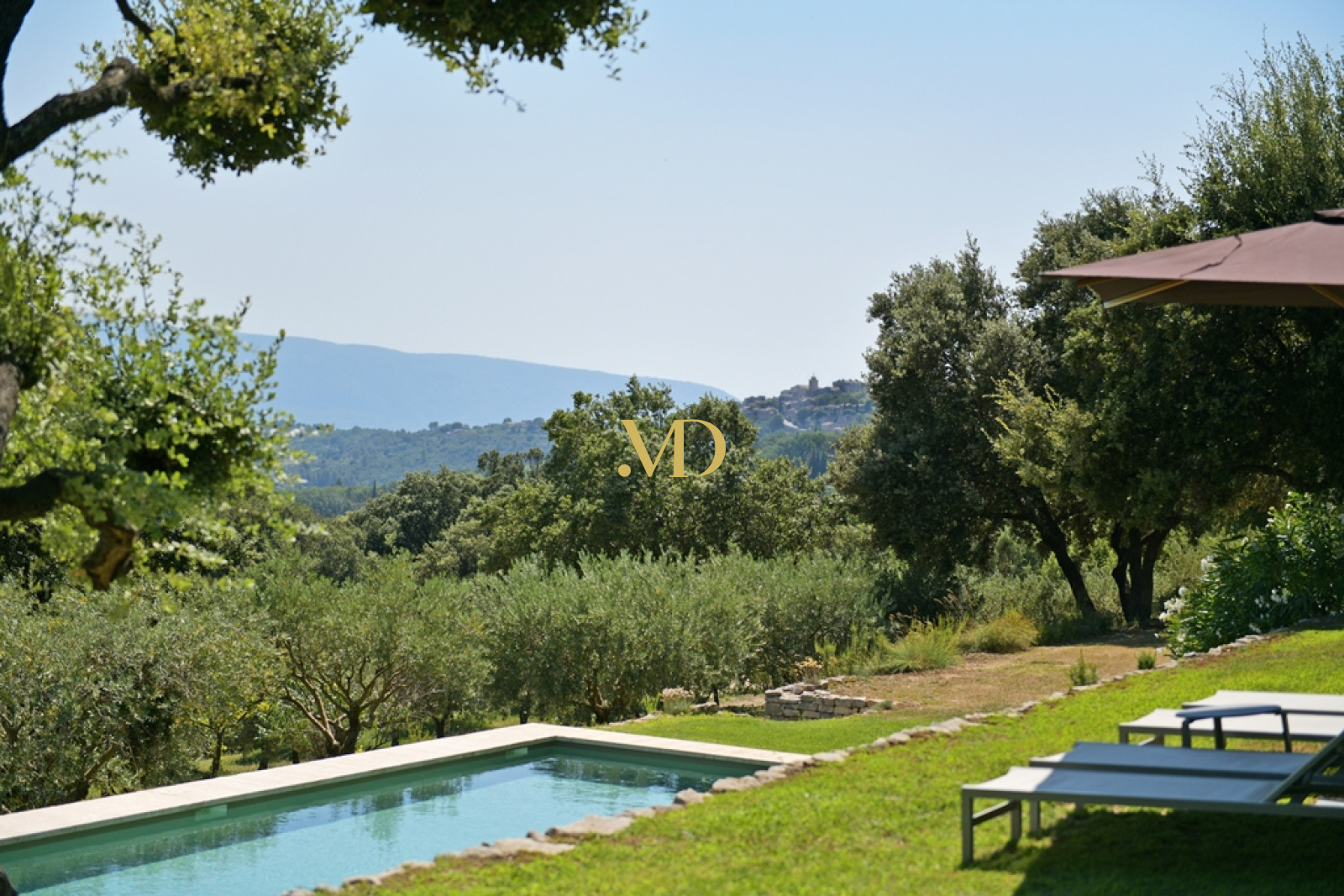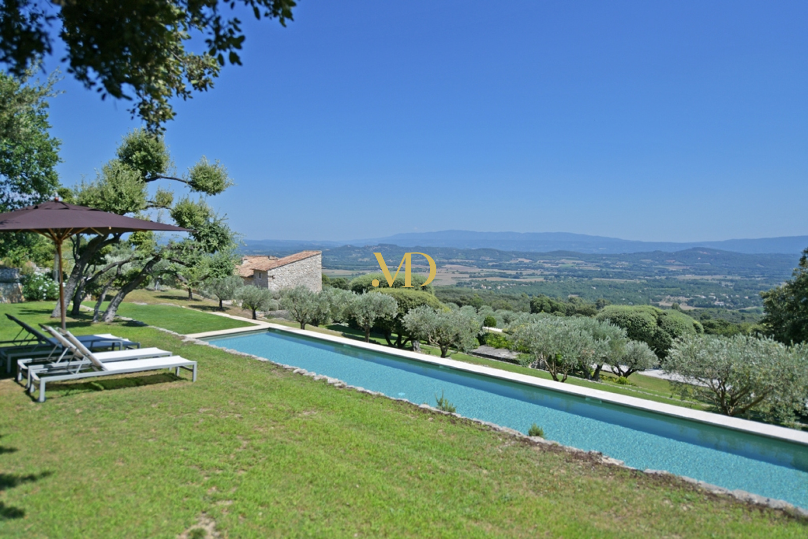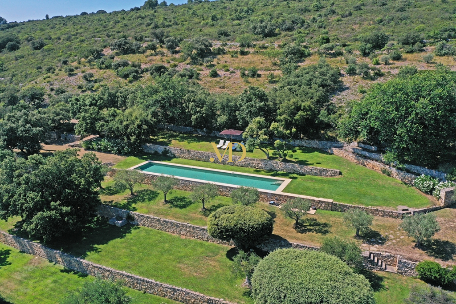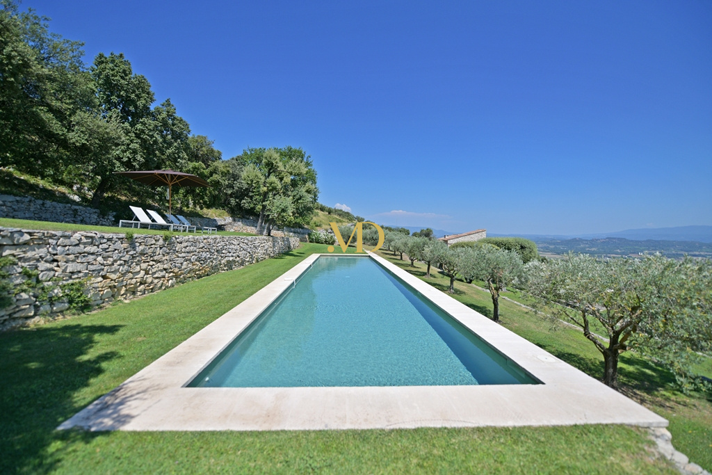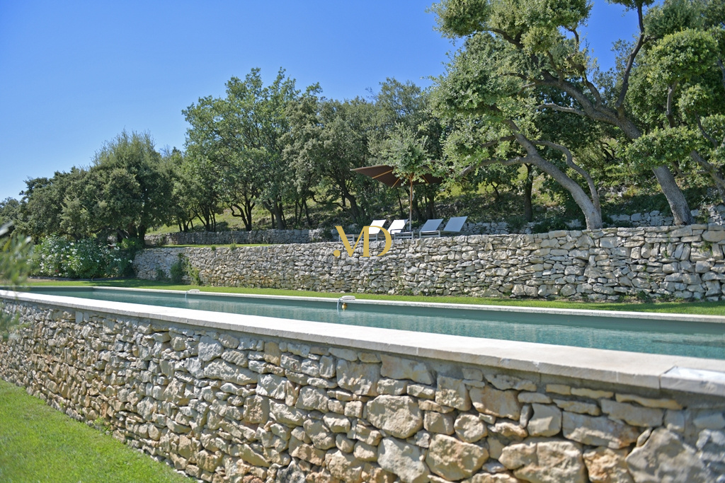 Les extérieurs sont tout aussi remarquables. Face à la maison, une vaste terrasse accueille un ancien bassin, un puits en pierre et un terrain de pétanque. En contrebas et sur les restanques, la propriété révèle un ancien rucher en pierre, des espaces ombragés propices à la détente, puis un exceptionnel bassin de nage de 20 mètres par 4, adossé à la colline et offrant une vue panoramique saisissante sur la vallée. Son intégration paysagère est parfaite, bordée de pelouse et tournée vers l’horizon.