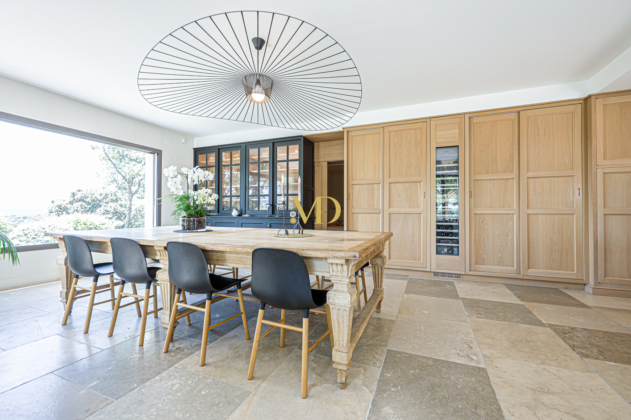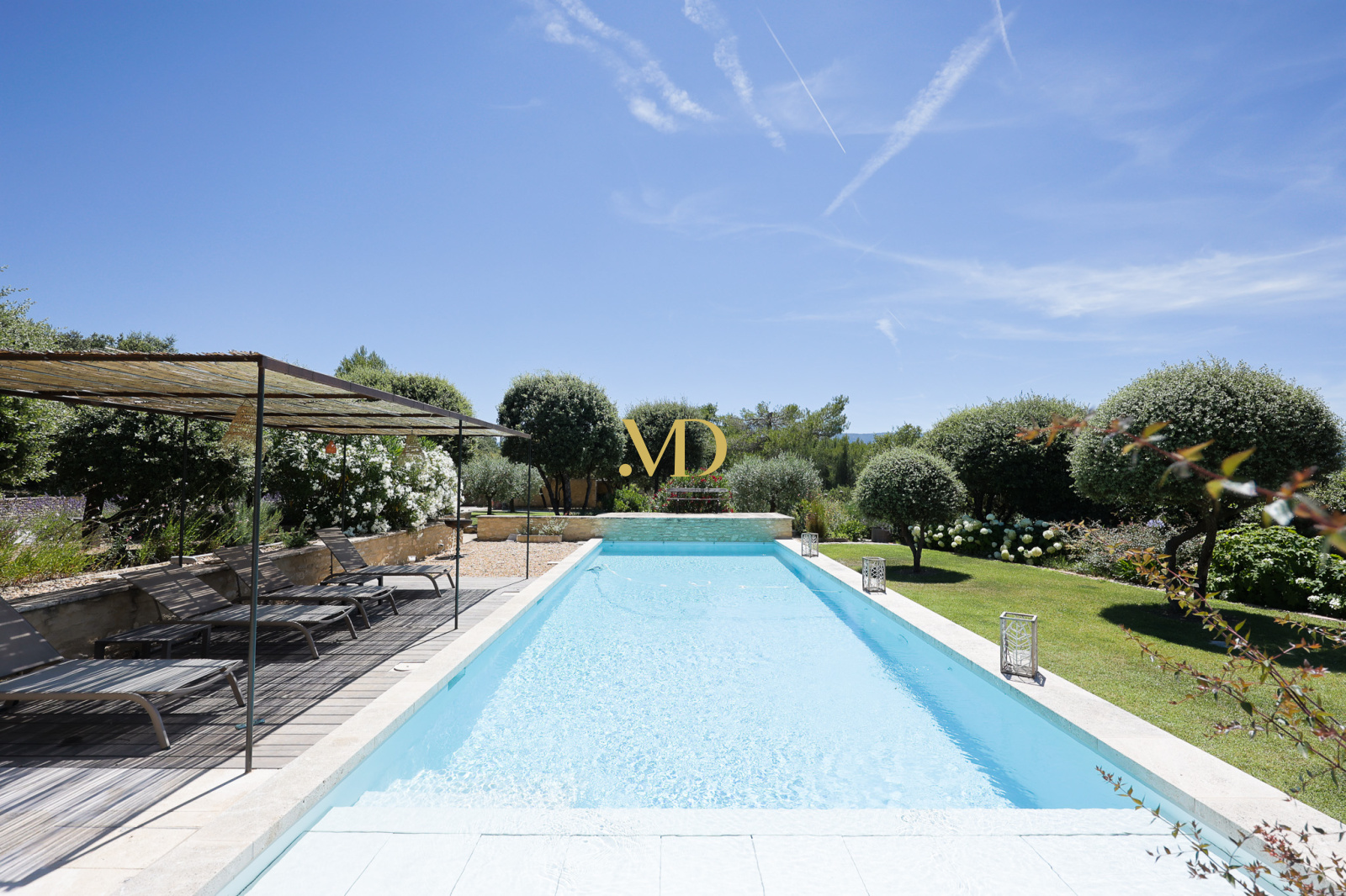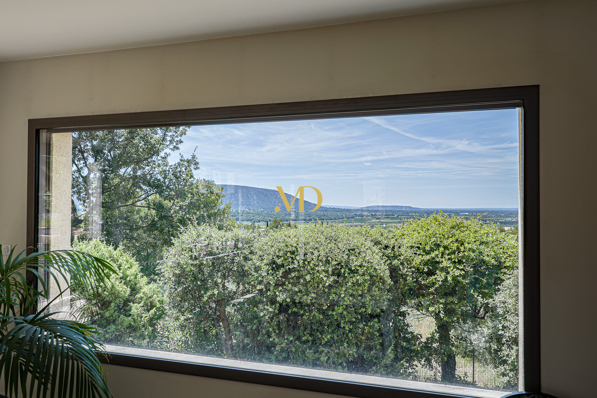 En franchissant le seuil, vous découvrirez un vestibule spacieux ouvrant sur un vaste espace de vie. Le salon, baigné de lumière grâce à une immense baie vitrée, s'ouvre sur une terrasse avec une vue imprenable sur la piscine et le jardin. La cuisine, équipée de matériaux et d'appareils haut de gamme, se prolonge par une salle à manger splendide avec un grand îlot central et une majestueuse table en bois. Les grandes ouvertures et la baie vitrée fixe offrent une vue époustouflante sur le Luberon et les Alpilles, et permettent de profiter des repas en extérieur sur la terrasse, ombragée par un magnifique mûrier.