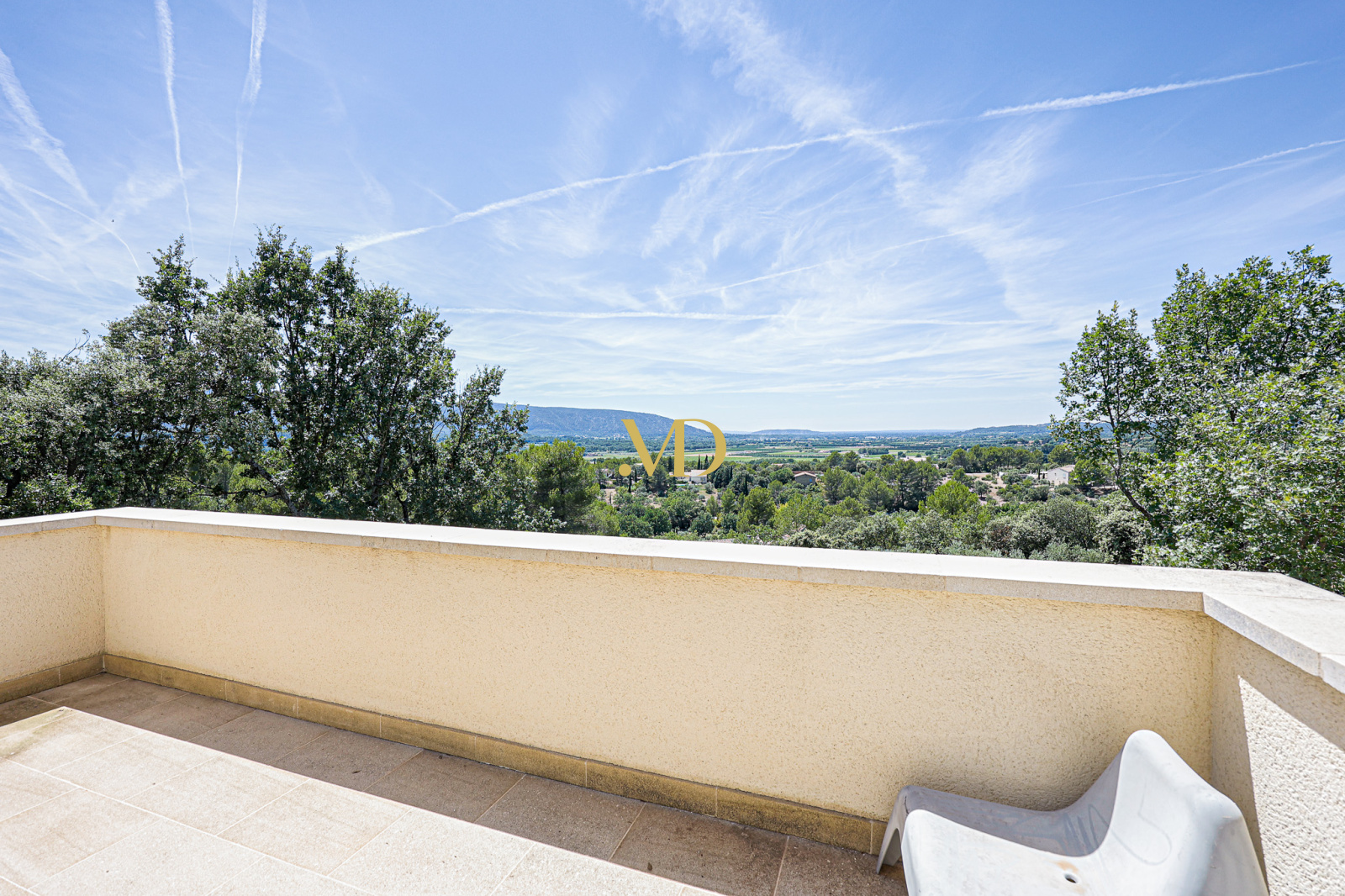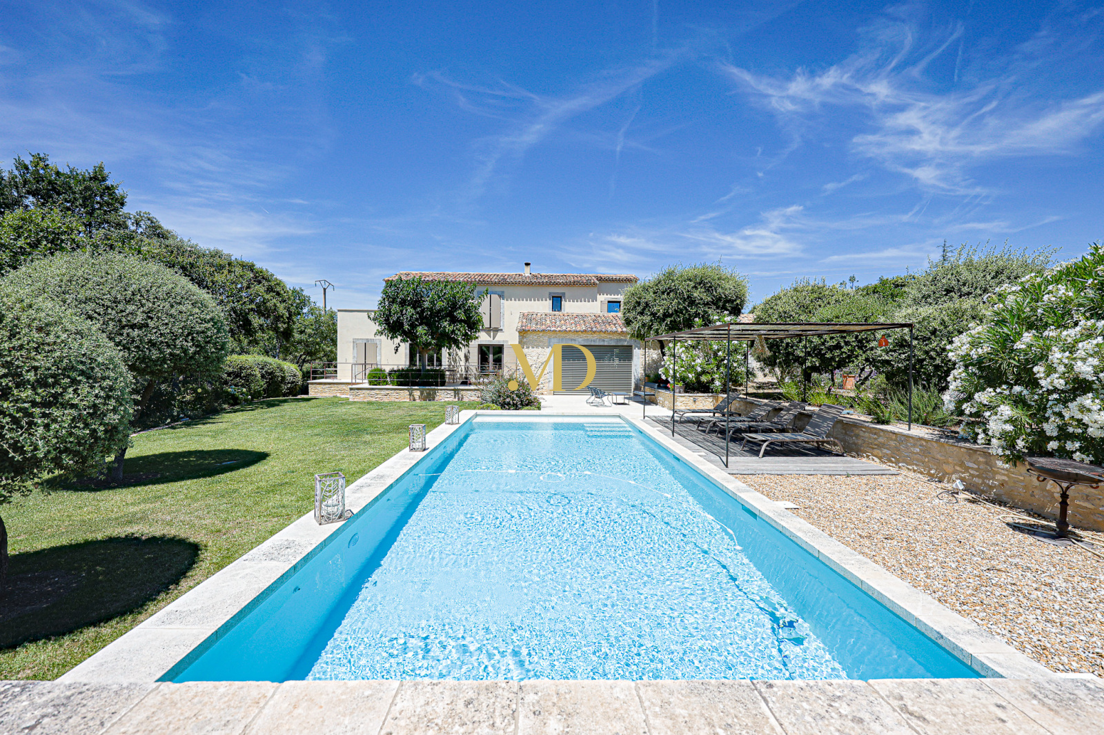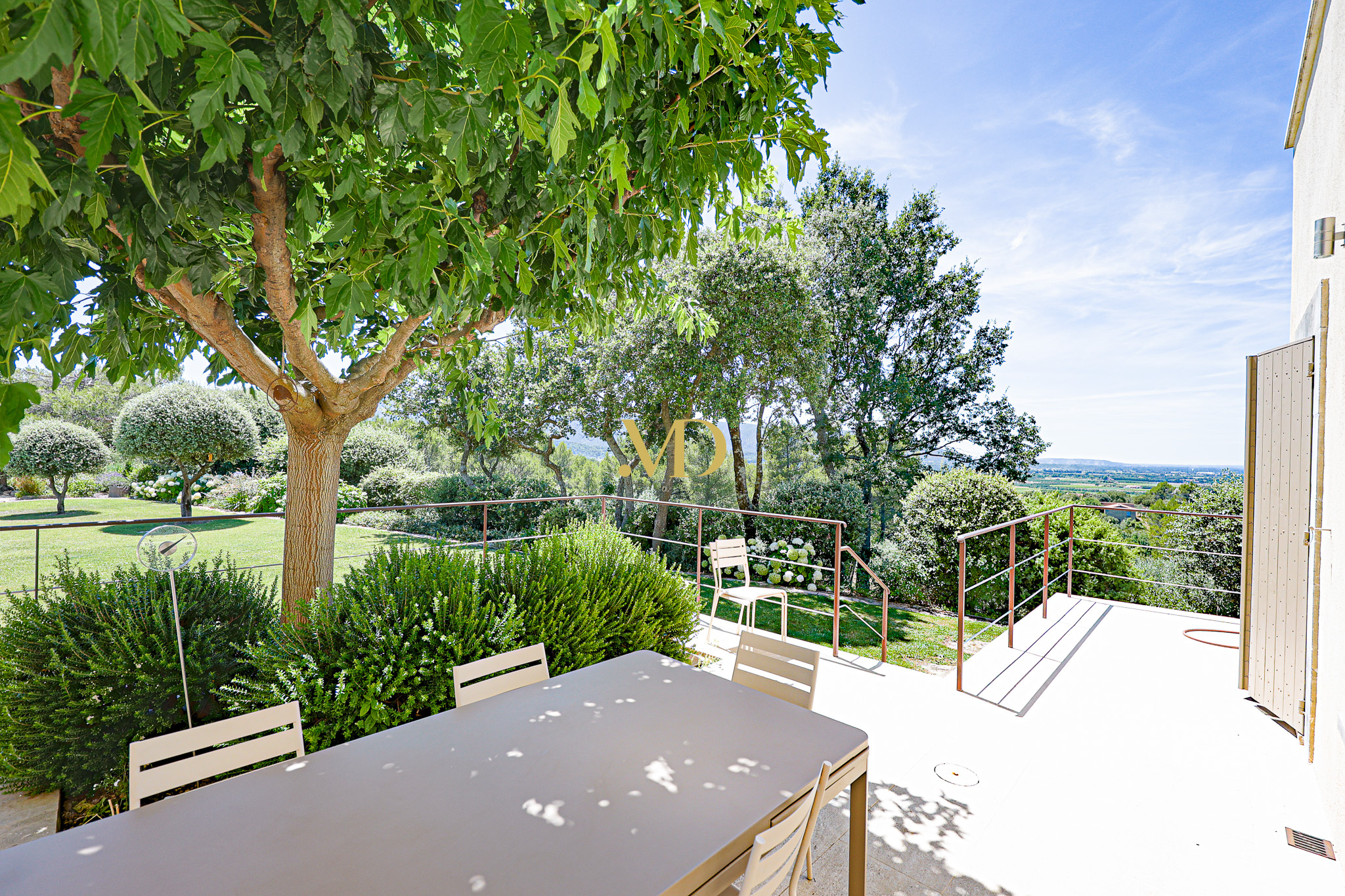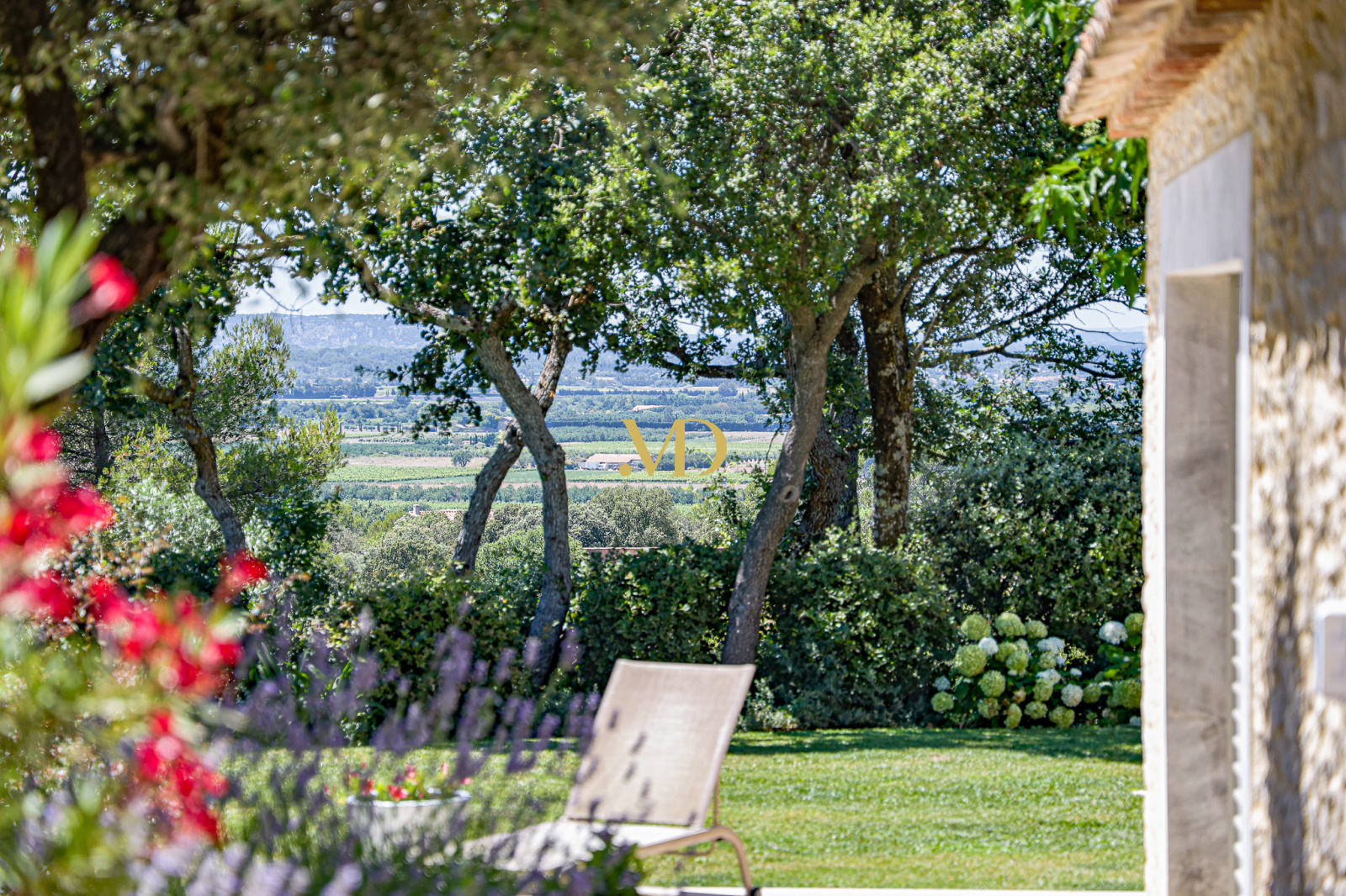 En franchissant le seuil, vous découvrirez un vestibule spacieux ouvrant sur un vaste espace de vie. Le salon, baigné de lumière grâce à une immense baie vitrée, s'ouvre sur une terrasse avec une vue imprenable sur la piscine et le jardin. La cuisine, équipée de matériaux et d'appareils haut de gamme, se prolonge par une salle à manger splendide avec un grand îlot central et une majestueuse table en bois. Les grandes ouvertures et la baie vitrée fixe offrent une vue époustouflante sur le Luberon et les Alpilles, et permettent de profiter des repas en extérieur sur la terrasse, ombragée par un magnifique mûrier.