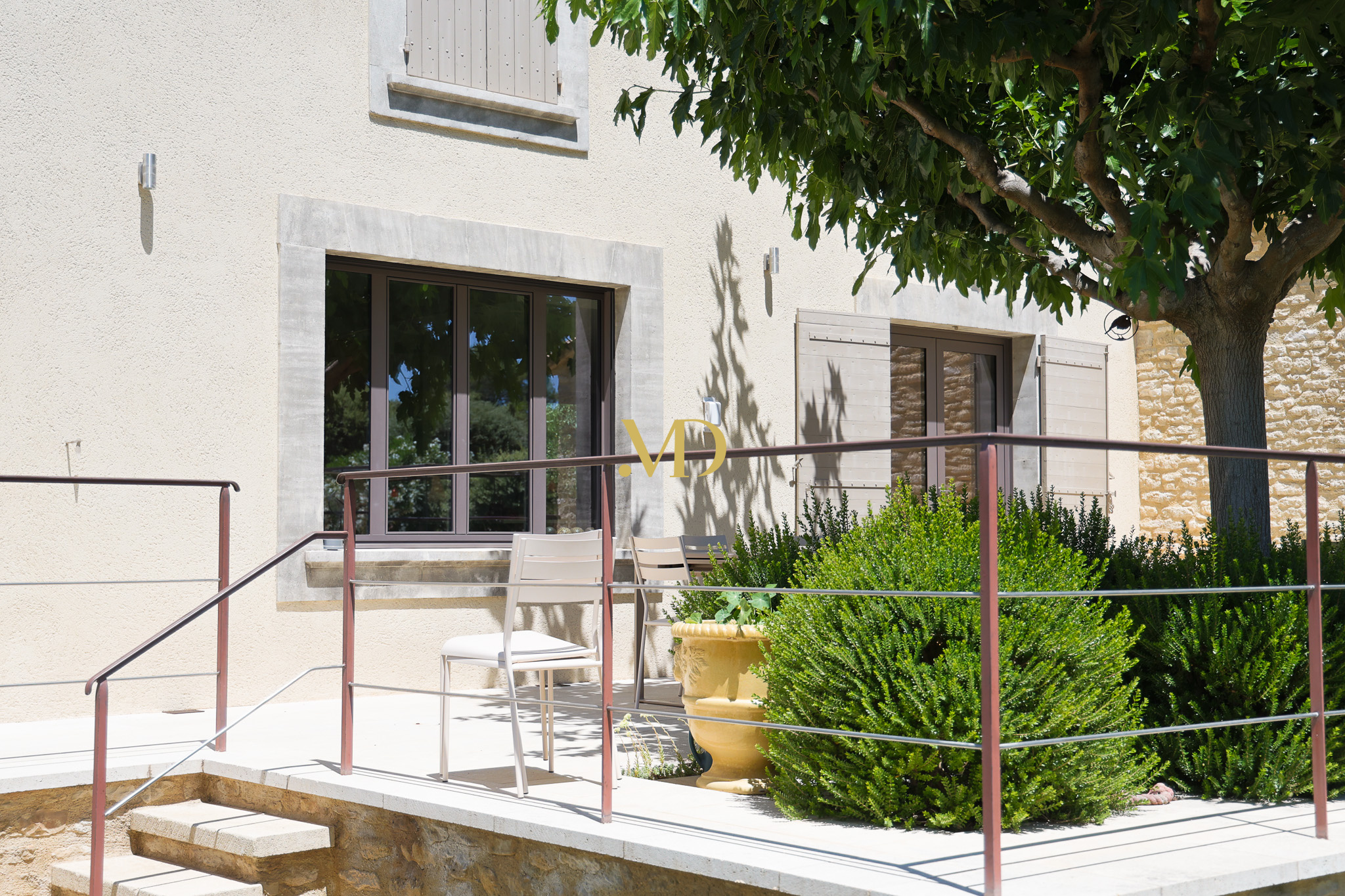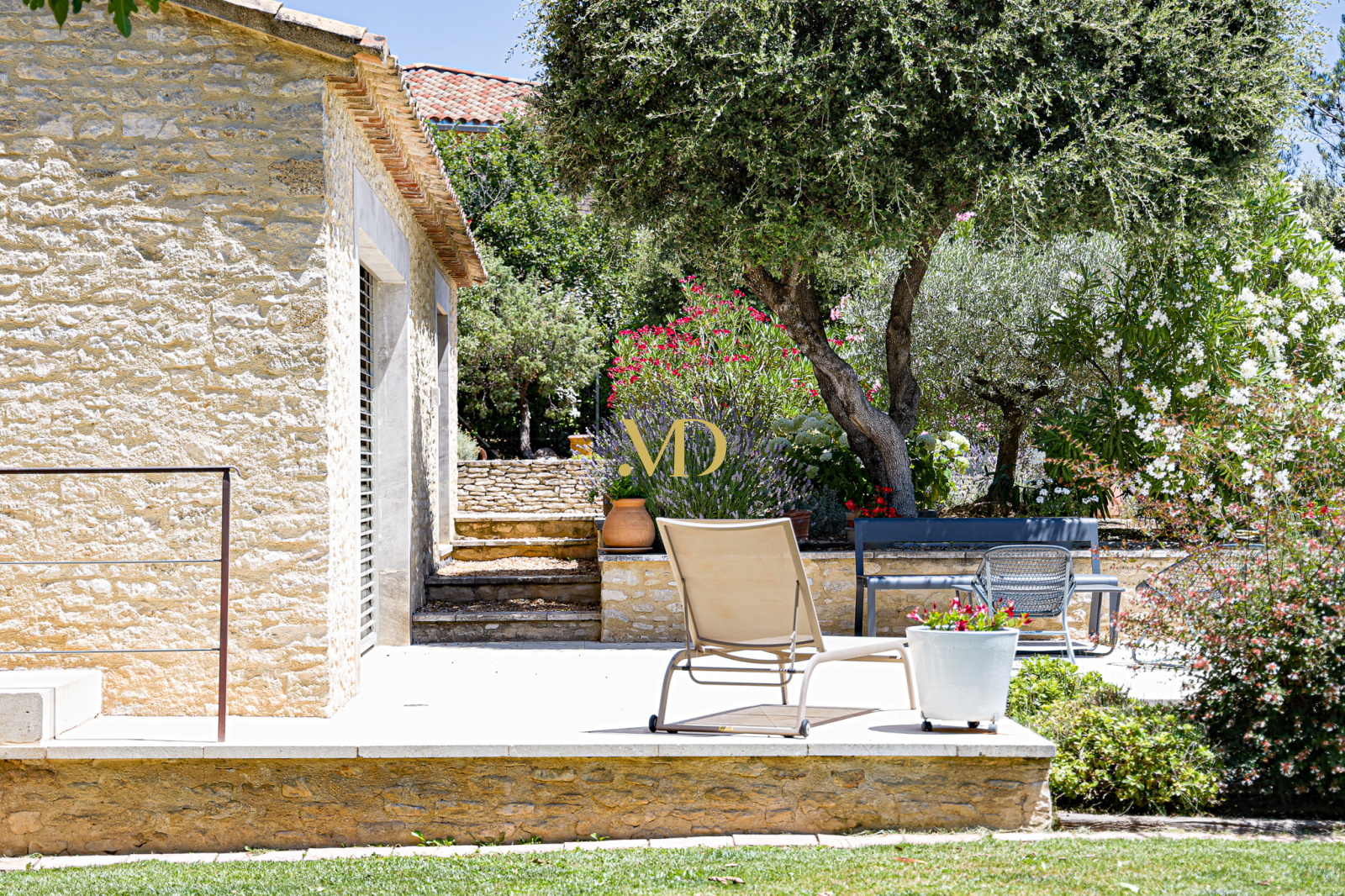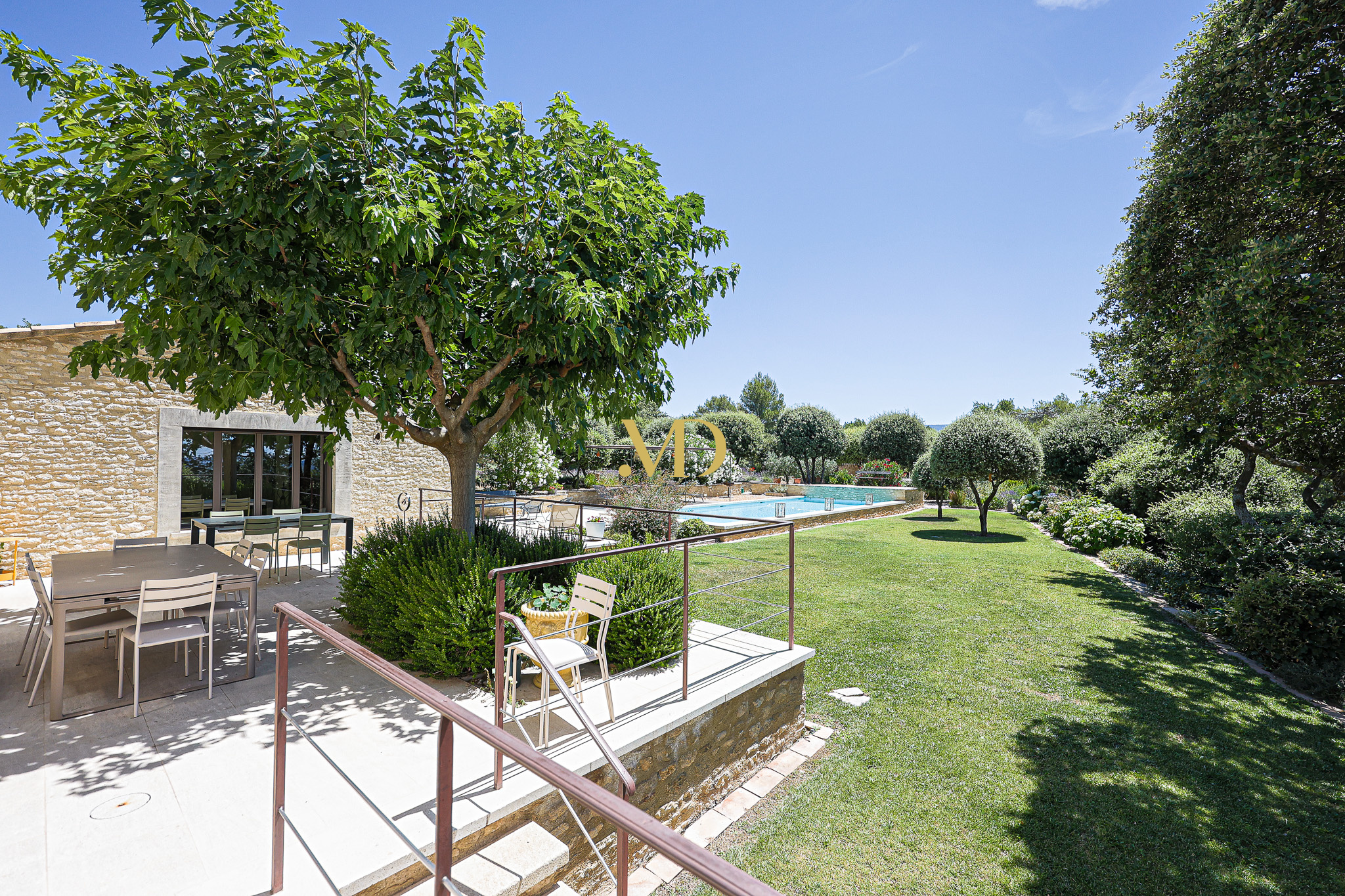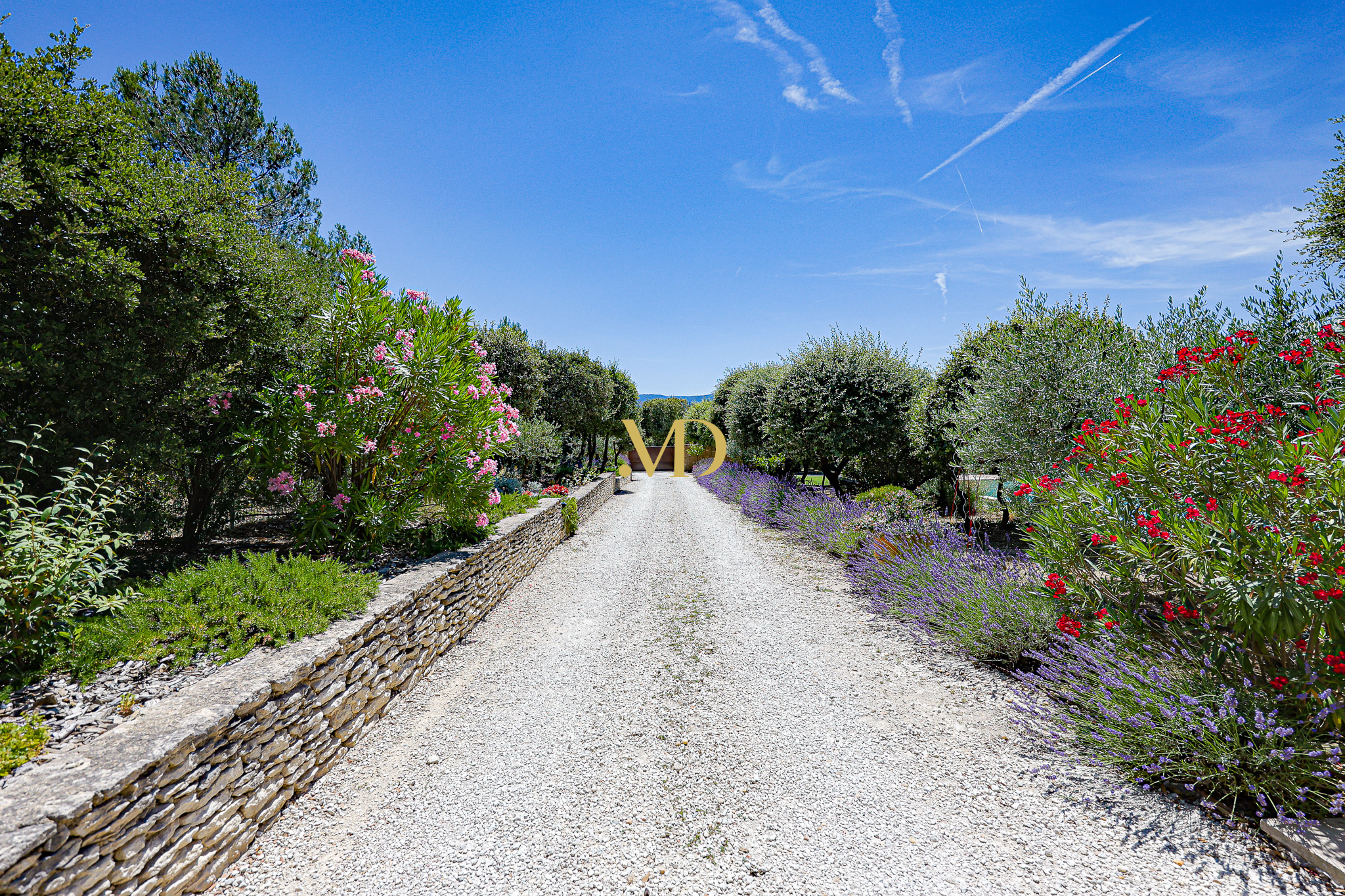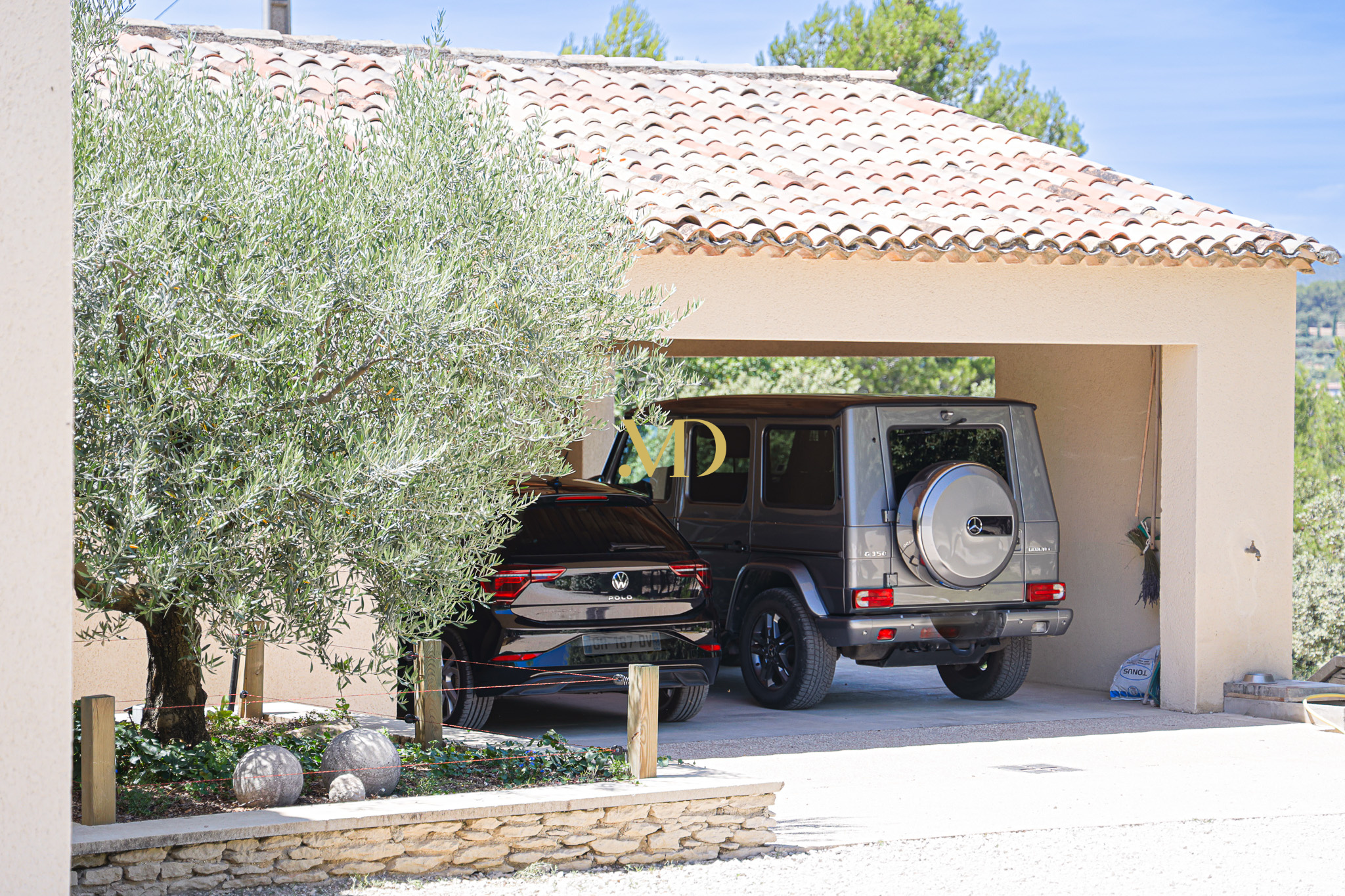 MAISON DUMON Vous propose cette somptueuse villa située à proximité de Gordes, un joyau rare offrant 260 m² de confort moderne et de luxe, nichée au cœur d'un terrain magnifiquement paysager de 3365 m². À l'entrée de la propriété, vous serez accueilli par un portail élégant et des murs en pierres sèches, menant à une allée fleurie jusqu'au garage et carport.