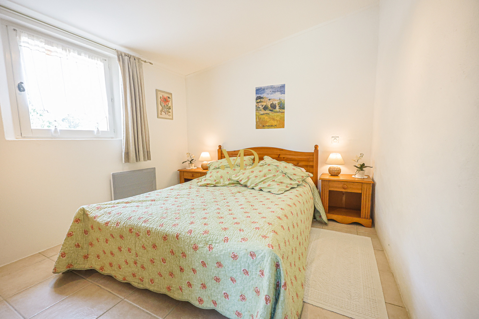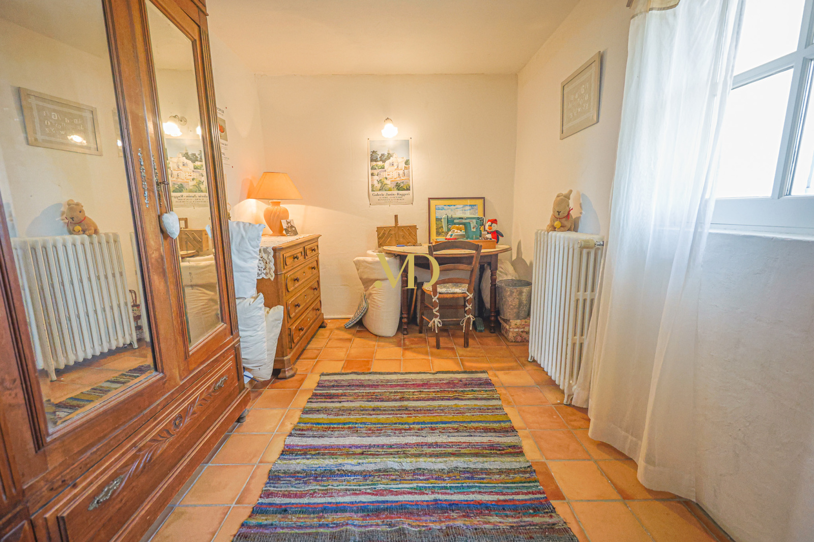 La maison principale, construite en pierre sur deux niveaux, séduit par son authenticité. Dès l’entrée, on découvre un salon chaleureux avec cheminée, avec une grande baie vitrée orientée plein sud, qui s’ouvre sur une terrasse ombragée par un beau mûrier. La cuisine, de style provençal, donne également sur cette terrasse et se prolonge vers une arrière-cuisine pratique. À l’étage, la partie nuit propose deux chambres, dont une vaste suite avec pièce attenante pouvant servir de dressing ou de chambre d’enfant, ainsi qu’une salle de bains confortable avec baignoire, douche et toilettes.